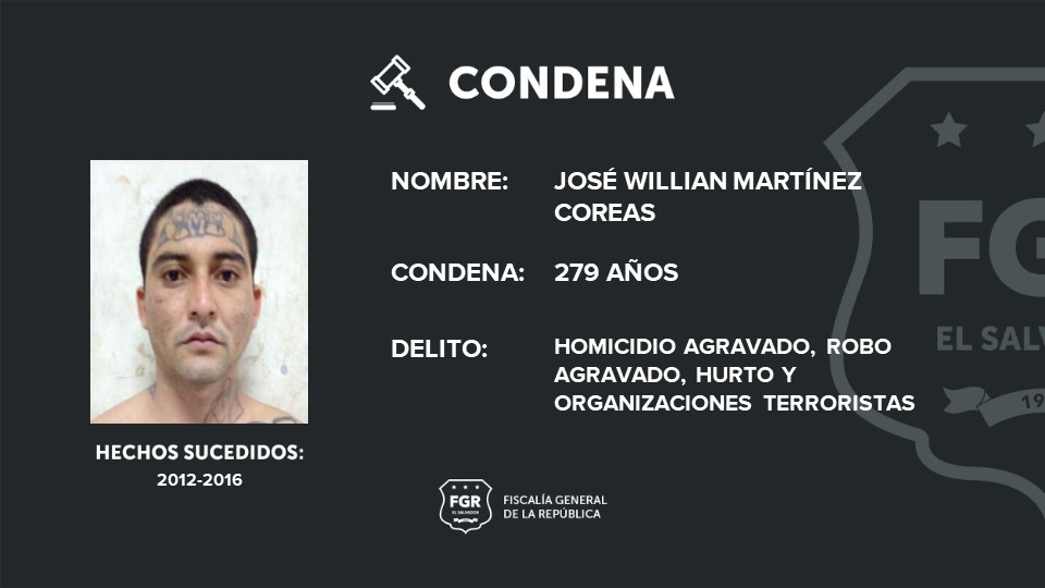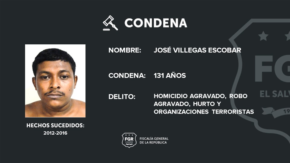 Entre los terroristas condenados está: José William Martínez Coreas, que fue sentenciado a 279 años de cárcel por los cinco homicidios agravados, por el robo agravado de un arma de fuego, el hurto de una vaca y organizaciones terroristas; José Francisco Guevara recibió una pena de 217 años de cárcel por cuatro homicidios, un hurto y organizaciones terroristas.