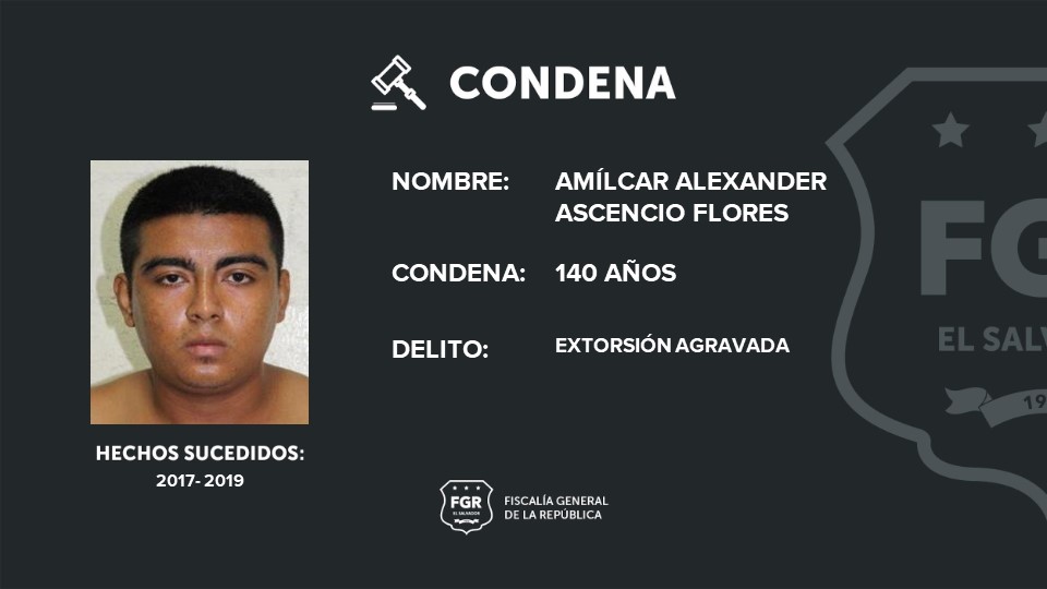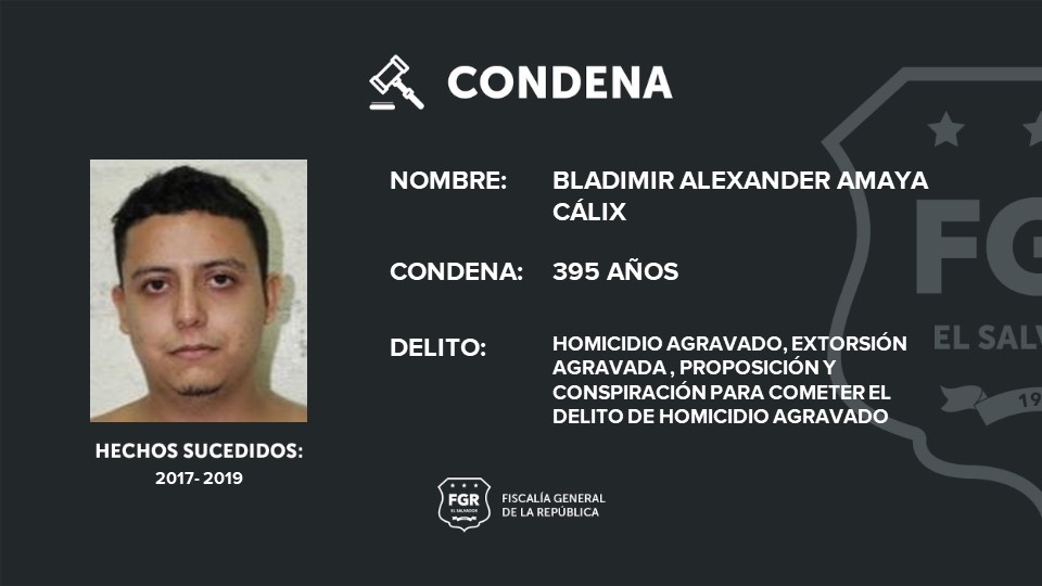 Las pruebas presentadas en juicio por la FGR  fueron contundentes para que Bladimir Alexander Amaya Cálix, fuera condenado a 220 años de cárcel por extorsión agravada, a 150 por homicidio agravado y a 25 por proposición y conspiración para cometer el delito de homicidio agravado. En total el Tribunal Segundo contra el Crimen Organizado B de San Miguel lo sentenció a 395 años de cárcel.