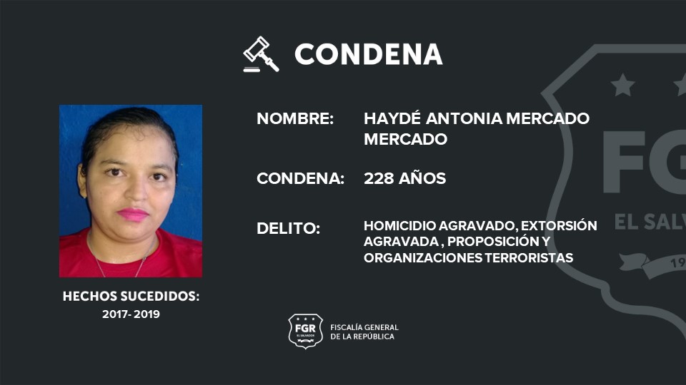 Mientras que Haydé Antonia Mercado Mercado fue sentenciada a 228 años de prisión por extorsión agravada, homicidio agravado y organizaciones terroristas. Amílcar Alexander Ascencio Flores deberá cumplir una sentencia de 140 años de cárcel por extorsión agravada.