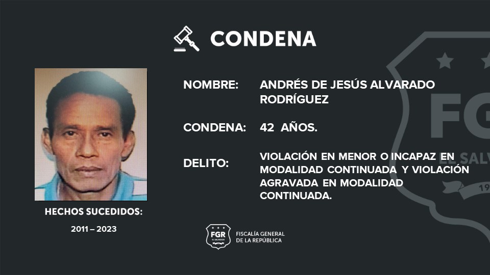 Usulután. La Fiscalía General de la República (FGR) consiguió que Andrés de Jesús Alvarado Rodríguez y Alicia Coralia Romero Ascencio sean condenados a 42 y 22 años y 9 meses de prisión, respectivamente, por violación en menor o incapaz agravada en modalidad continuada y violación agravada en modalidad continuada.