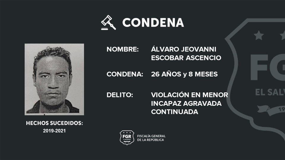 Santa Ana. La Fiscalía General de la República logró que Álvaro Jeovanni Escobar Ascencio fuera sentenciado a 26 años y ocho meses de prisión por haber violado a una menor de edad, durante dos años. Los hechos fueron cometidos en Santa Ana.