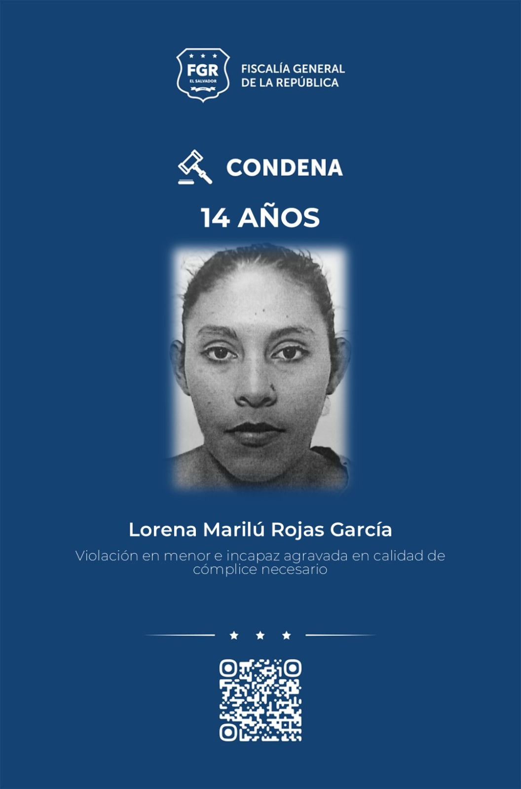 Ahuachapán. La Fiscalía General de la República (FGR) logró que Marcos David Zuniga Padilla fuera condenado a 45 años de prisión por los delitos de violación en menor e incapaz agravada y agresión sexual en menor e incapaz. Lorena Marilú Rojas García fue sentenciada a 14 años por cómplice necesario del delito de violación en menor e incapaz.