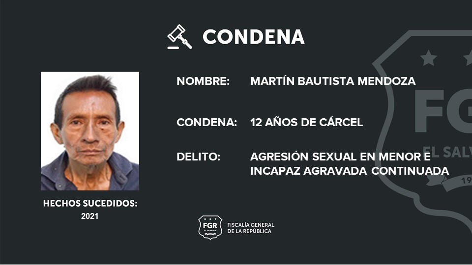Chalatenango. La Fiscalía General de la República (FGR) logró que Martín Bautista Mendoza fuera condenado a 12 años de cárcel por agredir sexualmente a una menor de edad en el cantón Guarjila en Chalatenango Sur, durante el 2021.