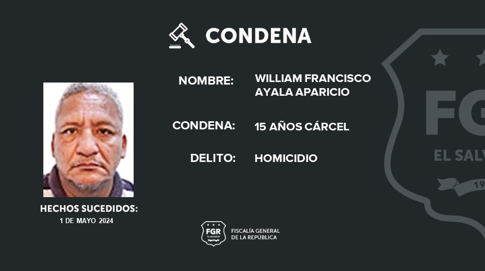 San Salvador. La Fiscalía General de la República (FGR) logró que William Francisco Ayala Aparición sea condenado a 15 años de prisión por haber asesinado a una persona en el Centro Urbano Málaga, San Salvador.