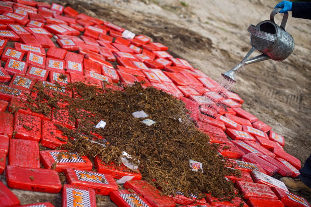 Changallo, Ilopango. La Fiscalía General en coordinación con la Policía Nacional Civil (PNC) procedieron a la destrucción de mil 280 kilos de cocaína, interceptada en alta mar, el pasado 27 de marzo a tres colombianos. El valor comercial de los estupefacientes es de $32,179,200.