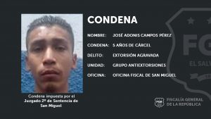 San Miguel. José Adonis Campos Pérez, miembro de la MS, recibió dinero exigido a través de amenazas a muerte, por lo que recibió una sentencia de 5 años de prisión al someterse a un procedimiento abreviado.