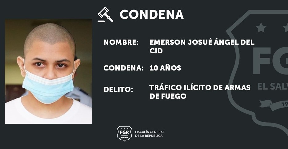 Emerson Josué Ángel Del Cid deberá cumplir una pena de prisión de 10 años, esto después que la Fiscalía General de la República logró demostrar en tenía en su poder diferentes cargadores de armas de fuego y que pretendía complementar con otras partes de las armas. Al imputado se le procesó por el delito de Tráfico Ilícito de Armas de Fuego.