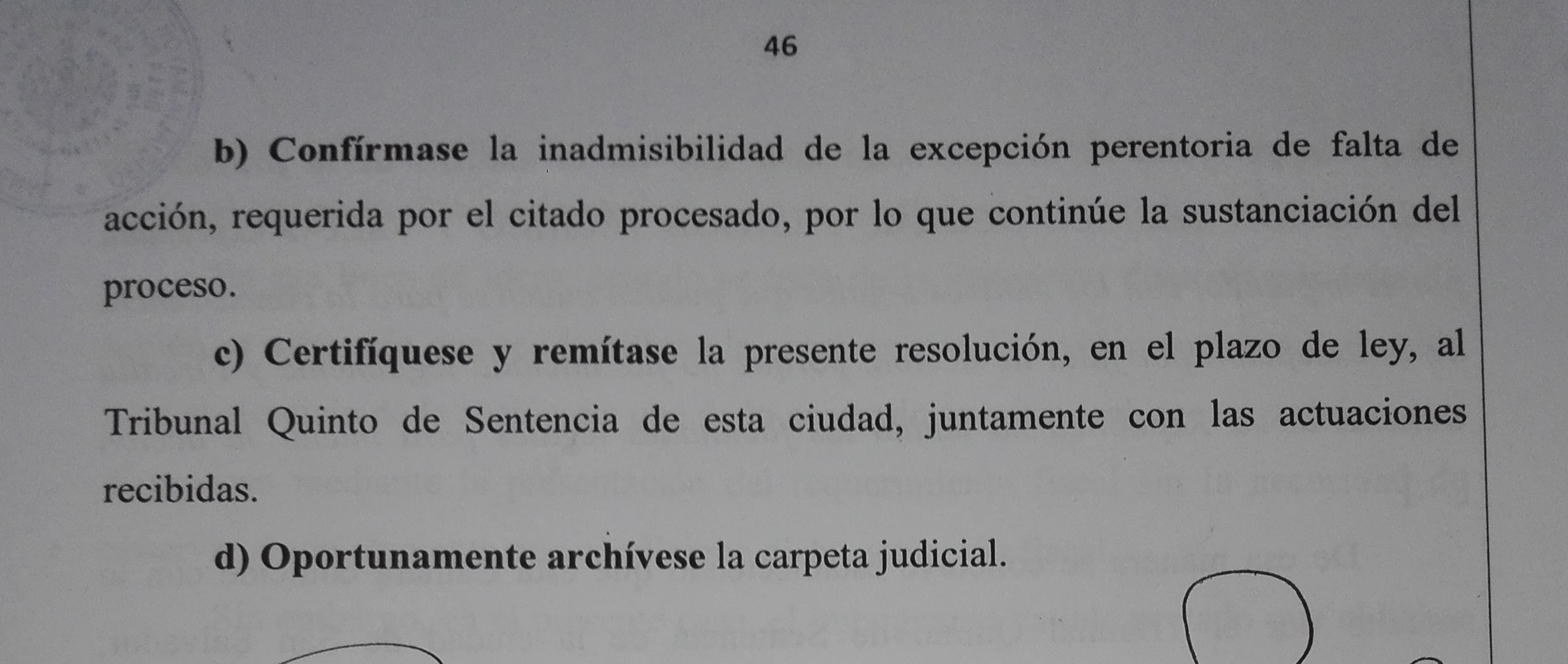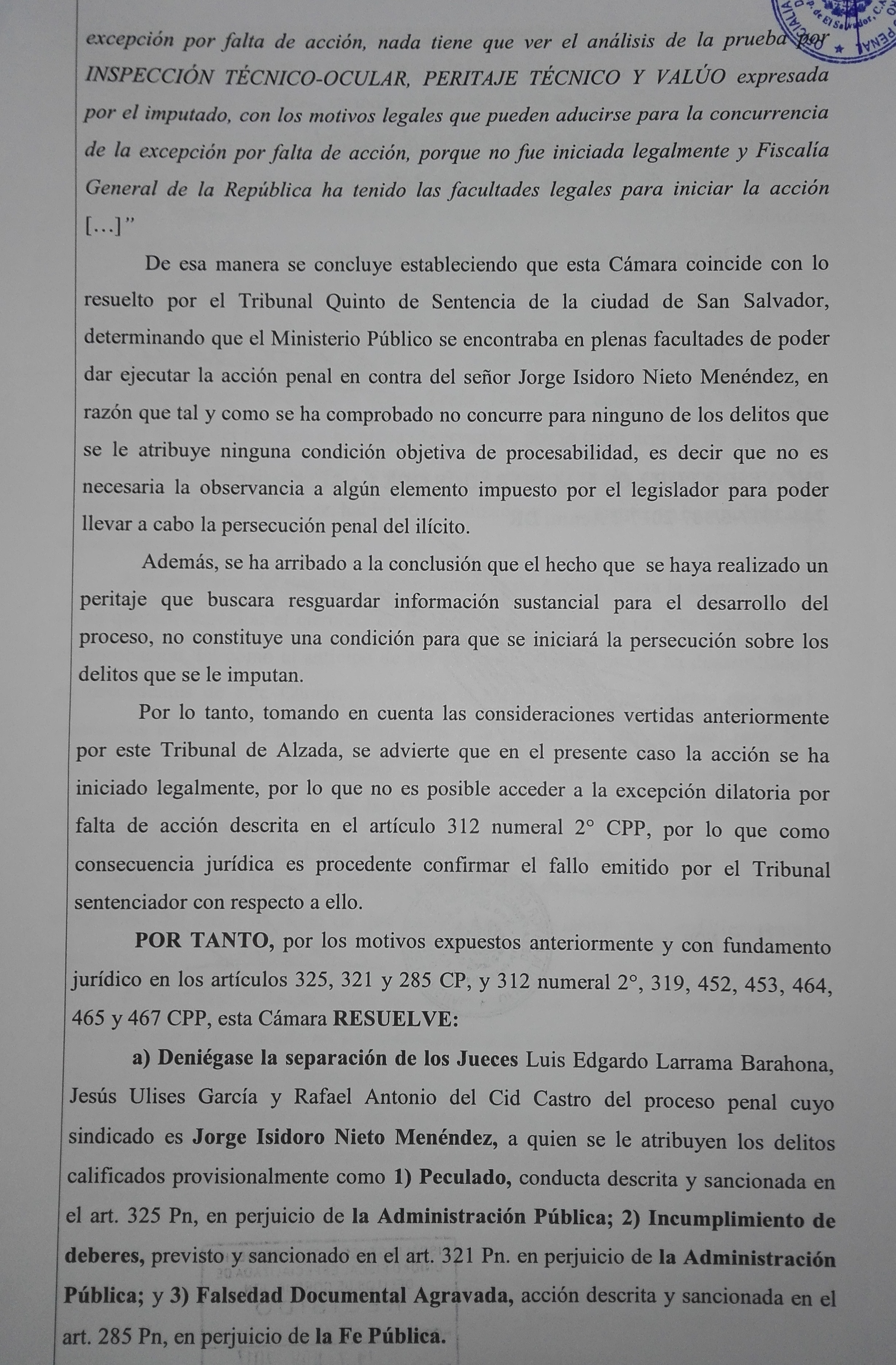 “Además, se ha arribado a la conclusión que el hecho que se haya realizado un peritaje que buscará guardar información sustancial para el desarrollo del proceso, no constituye una condición para que se iniciara la persecución sobre los delitos que se le imputan”, parte literal de la resolución. También, en la misma los magistrados reconocen la legalidad de la acción emprendida por la FGR y a su vez, respaldan las actuaciones del Tribunal Quinto de Sentencia.