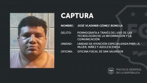 San Salvador. Fiscales de la Unidad de Atención Especializada para la Mujer, Niñez y Adolescencia de la sede fiscal en San Salvador lograron que José Vladimir Gómez Bonilla sea enviado a prisión mientras continúa el proceso penal en su contra por los delitos de Pornografía a través del uso de tecnologías de la información y comunicación y Adquisición o Posesión de material pornográfico de niñas, niños, adolescentes o personas con discapacidad a través del uso de las tecnologías de la información y comunicación