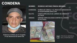 El informe de la Unidad Especializada Contra el Lavado de Activos señala que se trata de Rodrigo Antonio Pineda Miranda, quien fue procesado por el delito de Casos Especiales de Lavado de Dinero y Activos. La vista pública fue realizada por el Juzgado Segundo de Sentencia de Santa Ana.