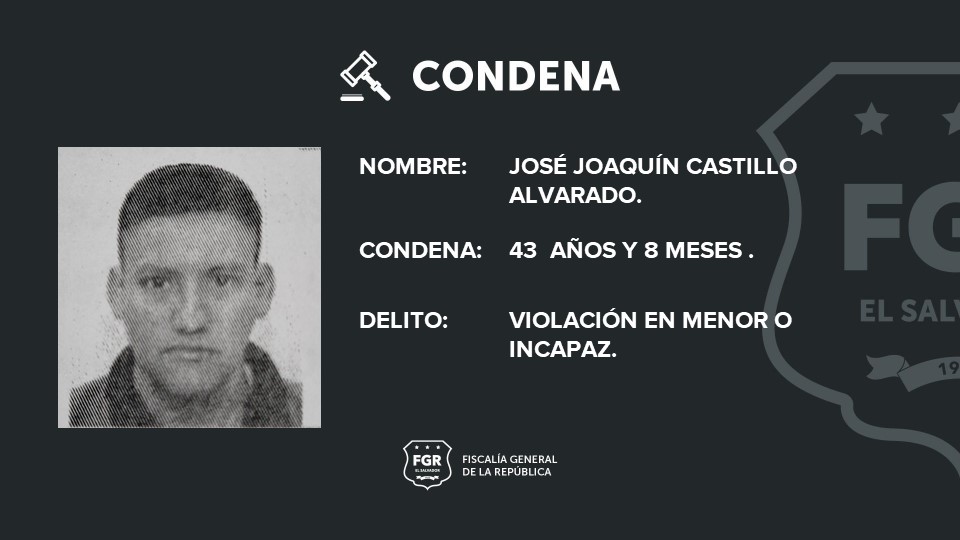 En el ejercicio de garantizar la protección especial de los derechos de toda niña y niño, la Fiscalía General de la República (FGR) logró una condena de 17 años de cárcel para José Joaquín Castillo Alvarado, por violar a un niño de 7 años de edad. Esta sentencia se le suma a la impuesta el pasado 30 de noviembre por haber violado durante 6 años a una niña; en total, el imputado deberá permanecer 43 años y 8 meses más en prisión. Los menores eran hermanos de crianza.
