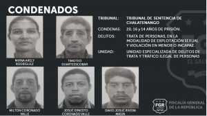 La Unidad Especializada Delitos Tráfico Ilegal y Trata de Personas, informó que los imputados son Mirna Arely Rodríguez Rivera, David Josué Rivera Masón, Timoteo Duarte Escobar, Josué Ernesto Corona Valle y Milton Corona Valle. De acuerdo a la participación que tuvieron en este caso, enfrentaron los delitos de Trata de personas, en la modalidad de Explotación Sexual y Violación en Menor o Incapaz.