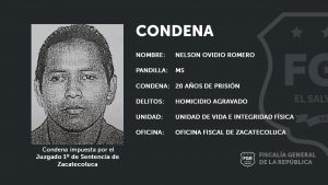 En la Vista Pública desarrollada por el Juzgado Primero de Sentencia de Zacatecoluca, el juez declaró culpable a Nelson Ovidio Romero, por el delito de Homicidio Agravado, condenándole a 20 años de prisión; luego de que la representación Fiscal, presentara elementos de prueba de tipo documental, pericial y testimonial.