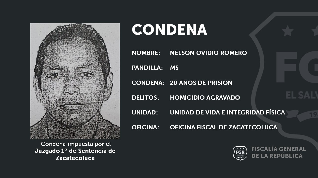 La Paz. La oficina fiscal de Zacatecoluca, a través de su Unidad de Vida e Integridad Física informa que, en audiencia de vista pública realizada en el Juzgado Primero de Sentencia de esta ciudad, se obtuvo sentencia condenatoria de 20 años de prisión en contra Nelson Ovidio Romero; a quien se le atribuyó el delito de Homicidio Agravado, en perjuicio de Saúl Moisés Méndez Burgos, según explicó el jefe de dicha sede fiscal, Daniel Domínguez.