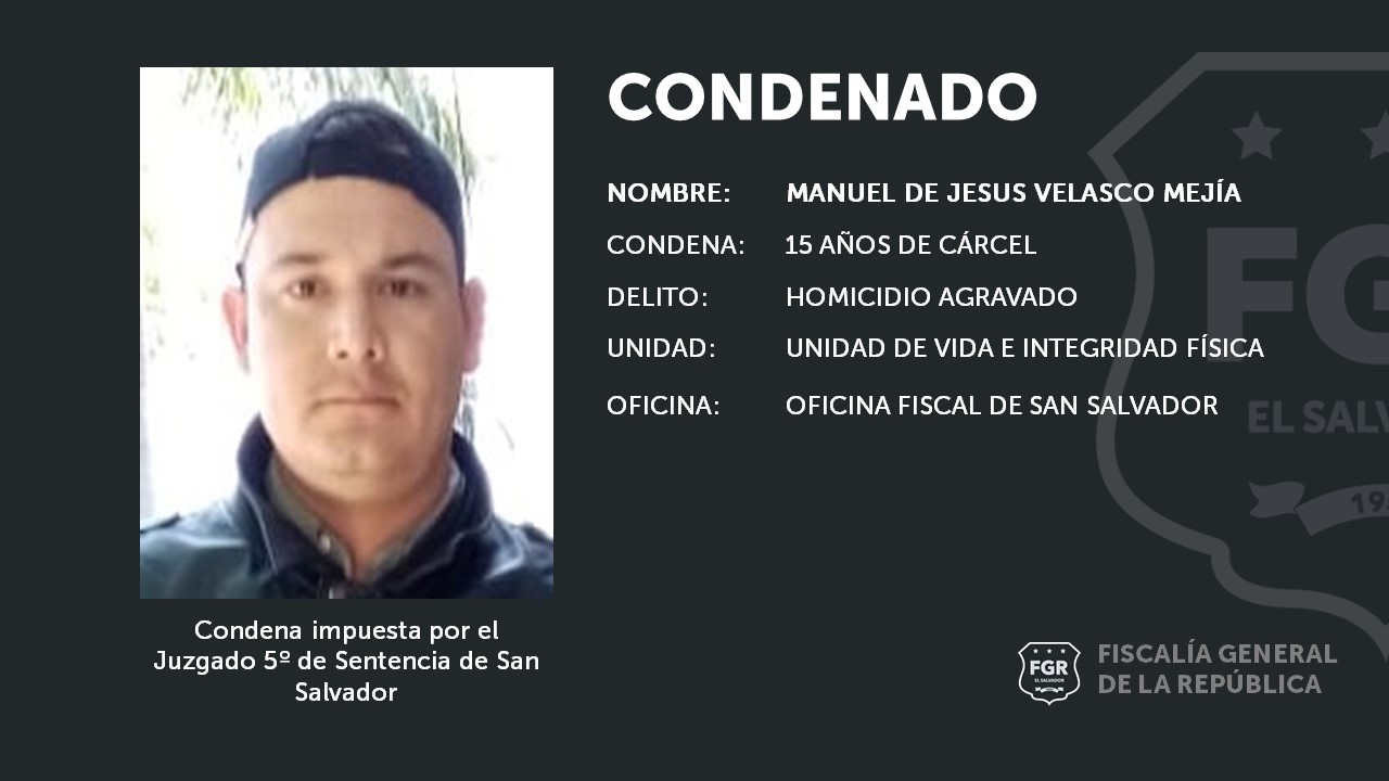 San Salvador. La Unidad de delitos relativos a la Vida de la oficina Fiscal de San Salvador obtuvo la condena de 15 años de cárcel en contra del sargento Manuel de Jesús Velasco Mejía, por el delito de Homicidio Agravado en perjuicio del teniente Benny Andrew Rivas Ayala, hecho ocurrido el 31 de octubre de 2019, en esta capital.