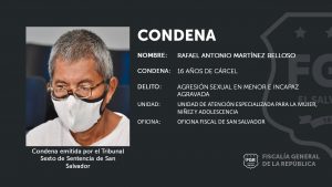 San Salvador. La Unidad de Atención Especializada para la Mujer, la Niñez y la Adolescencia de la sede fiscal en San Salvador informó que el Tribunal Sexto de Sentencia de San Salvador condenó a Rafael Antonio Martínez Belloso a 16 años de prisión por el delito de Agresión Sexual en perjuicio de una menor de edad.