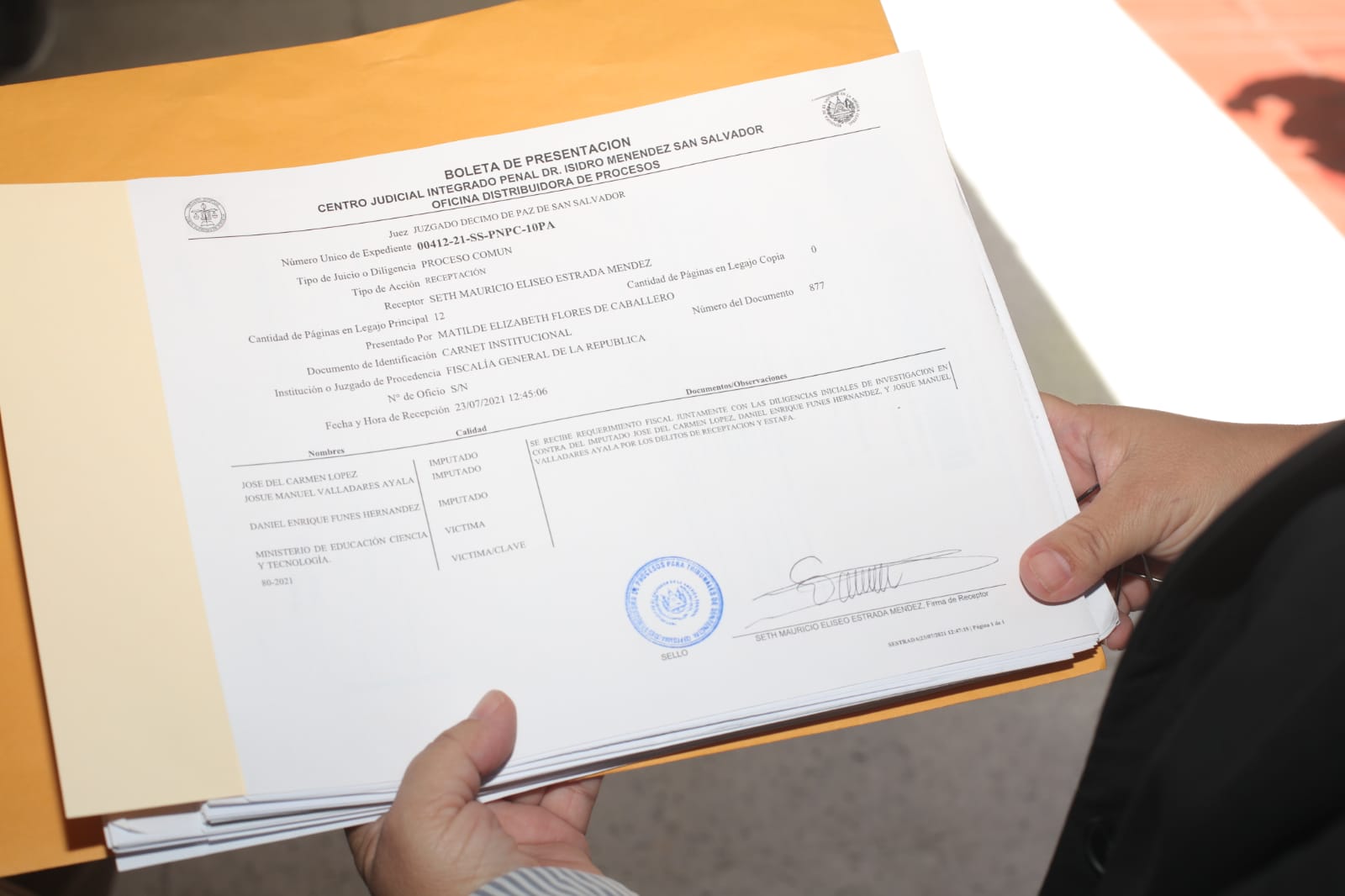 San Salvador. Fiscales de la Unidad Penal del Estado en San Miguel presentaron este viernes, en el Juzgado Décimo de Paz, el requerimiento en contra de tres personas en cuyo negocio fueron encontradas computadoras propiedad el Ministerio de Educación.