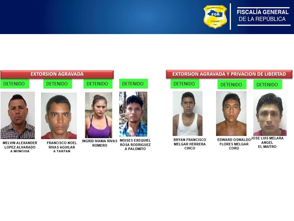 Entre los detenidos por Extorsión Agravada están: Moisés Ezequiel Rosa Rodríguez, Francisco Noel Rivas Aguilar, Melvin Alexander López Alvarado, Ingrid Ivania Rivas Romero.