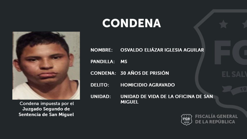 San Miguel. Por ser coautor en el Homicidio Agravado de un soldado de la Fuerza Armada, el integrante de la MS, Osvaldo Eliázar Iglesia Aguilar estará sus próximos 30 años tras los barrotes de una prisión.