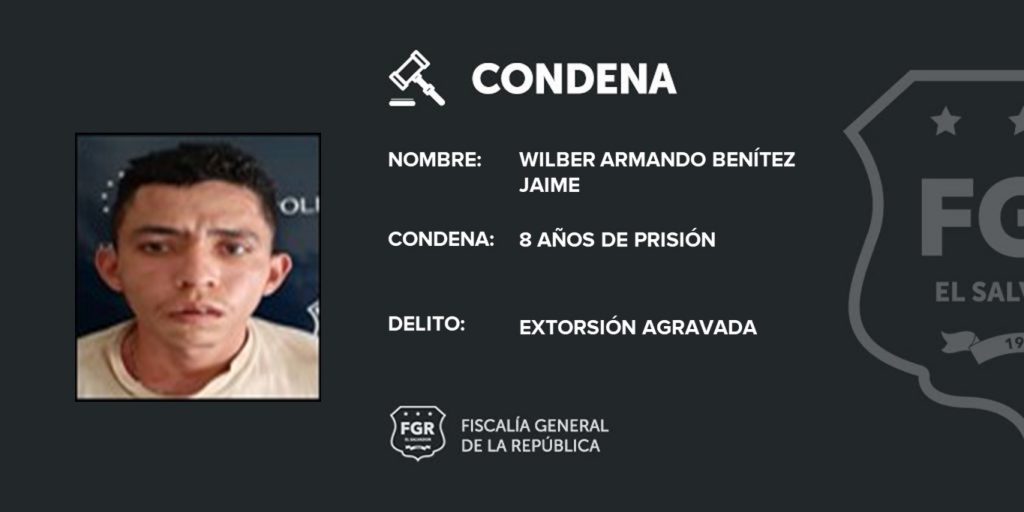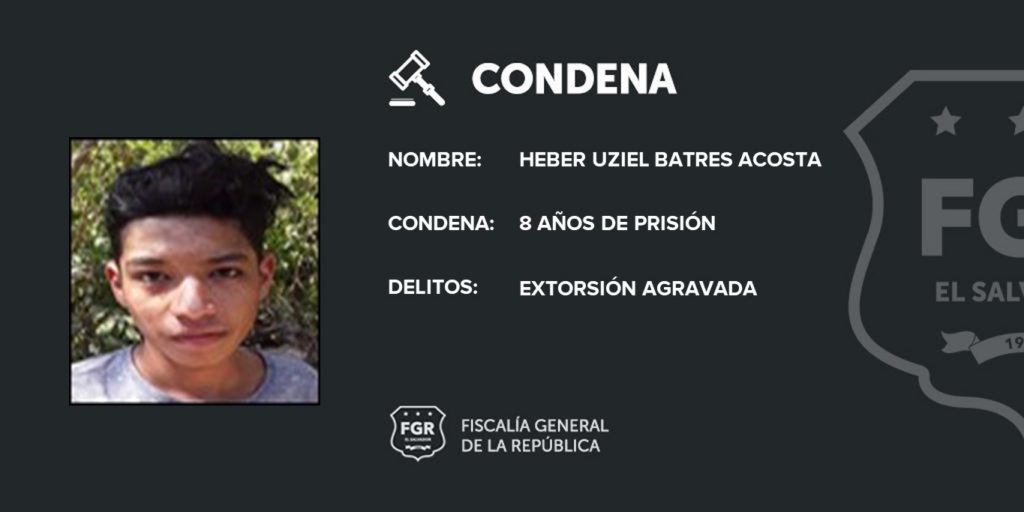 San Miguel. Heber Uziel Batres Acosta y Wilber Armando Benítez Jaime, integrantes de la MS, aceptaron voluntariamente que recibieron $200 dólares -cada uno- y que fueron exigidos a la víctima a través de amenazas a muerte. Por el delito se les impuso una pena de 8 años de prisión por extorsión agravada, afirmó el fiscal del equipo Antiextorsiones de la sede de San Miguel.