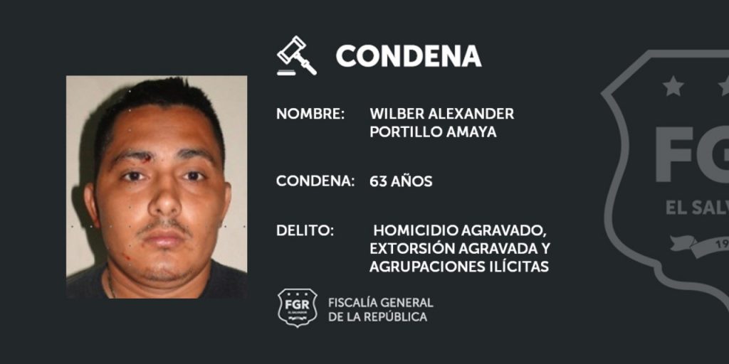 Wilber Alexander Portillo Amaya, integrante del grupo Amargura de la MS que operaba entre los años 2013 y 2017 en el centro de San Miguel, recibió una condena de 63 años por el Homicidio Agravado en perjuicio del sargento de la PNC, José Manuel Guardado Serrano, así como por los delitos de Extorsión y Agrupaciones Ilícitas.