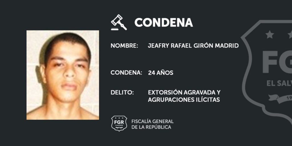 Otro integrante del grupo delincuencial de la MS, Jeafry Rafael Girón Madrid, fue sentenciado a 24 años de prisión por extorsión y agrupaciones ilícitas.