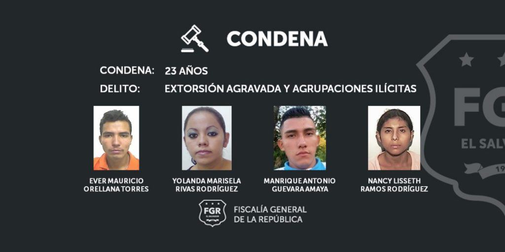 Y Ever Mauricio Orellana Torres, Nancy Lisseth Ramos Rodríguez, Manrique Antonio Guevara Amaya y Yolanda Marisela Rivas Rodríguez recibieron una pena de prisión de 23 años, por los mismos delitos. A seis mareros más también les impusieron penas de 20 años.