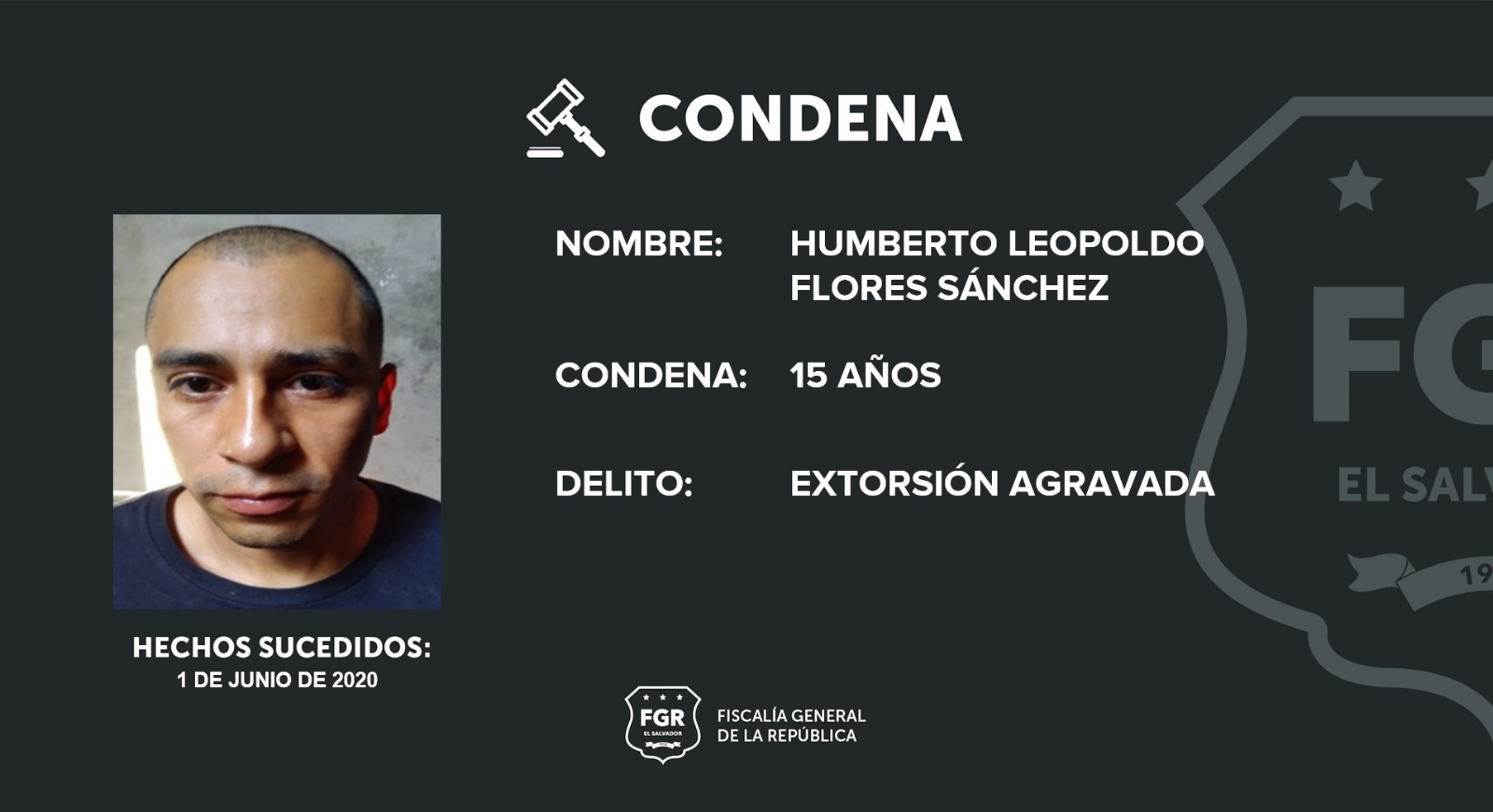 Cojutepeque, Cuscatlán. Gracias a las pruebas presentadas por los fiscales, fue posible condenar a Humberto Leopoldo Flores Sánchez a 15 años de prisión por el delito de extorsión agravada. Los hechos ocurrieron el 1 de junio del año 2020, en el distrito de San Rafael Cedros, departamento de Cuscatlán.