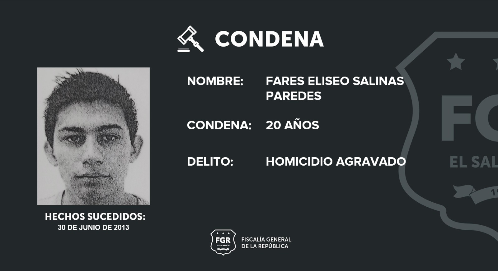 Cojutepeque, Cuscatlán. Gracias a las pruebas aportadas por los fiscales en un juicio se logró condenar a 20 años de prisión a Fares Eliseo Salinas Paredes, miembro activo de la Mara Salvatrucha, MS-13; al imputado se le procesó por el delito de homicidio agravado.