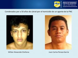 La Paz. La Unidad Especializada Antipandillas y Delitos de Homicidio de la Fiscalía General de la República, FGR, dio a conocer la tarde de este jueves, la sentencia de tipo condenatoria pronunciada por el Tribunal Primero de Sentencia de Zacatecoluca, departamento de La Paz, en contra de dos terroristas quienes cumplirán 50 años de prisión. Son culpables por el crimen de un agente policial.