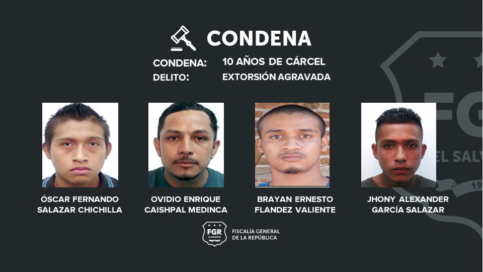 Ahuachapán. La Fiscalía en juicio logró diez años de cárcel para Óscar Fernando Salazar Chinchilla, Ovidio Enrique Caishpal Medina, Brayan Ernesto Flandez Valiente, Jhony Alexander García Salazar por haber extorsionado a un comerciante de la zona urbana de Ahuachapán.