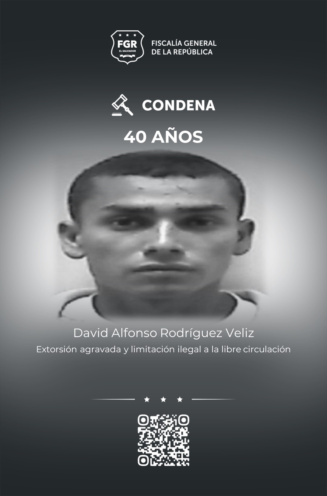David Alfonso Rodríguez Veliz pasará tras las rejas de una prisión 40 años. 20 años por extorsión agravada, a quien además deberá pagar US$1,400.00 en concepto de responsabilidad civil. Además se le sumaron, 20 años por dos víctimas de limitación ilegal a la libertad de circulación.