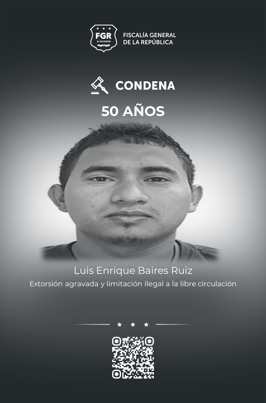 Entre ellos, Luis Enrique Baires Ruiz, que tiene calidad de reo presente, estará en la cárcel sus próximos 50 años, por un caso de extorsión agravada (20 años) y tres casos de limitación ilegal a la libre circulación (10 años por cada víctima).