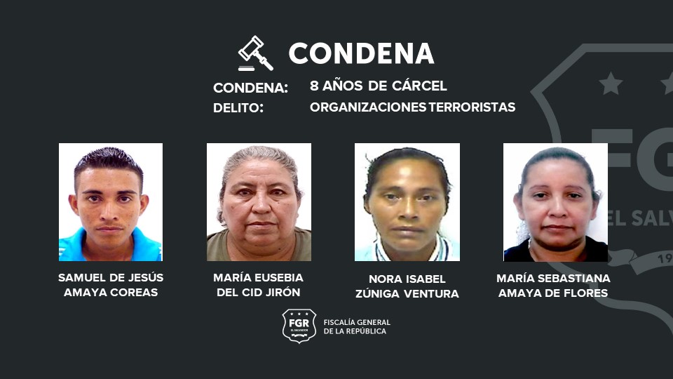 Otros cuatro mareros: Samuel de Jesús Amaya Coreas, María Eusebia del Cid Jirón, Nora Isabel Zúniga Ventura y María Sebastiana Amaya de Flores recibieron una sentencia de 8 años de prisión por organizaciones terroristas.