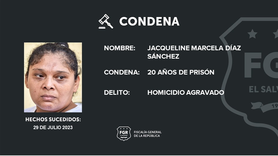 Santa Tecla, La Libertad Sur. A 20 años de cárcel fue condenada Jacqueline Marcela Díaz Sánchez por haber asesinado a un hombre el 29 de julio del 2023 en un mesón de Colón, La Libertad Oeste.