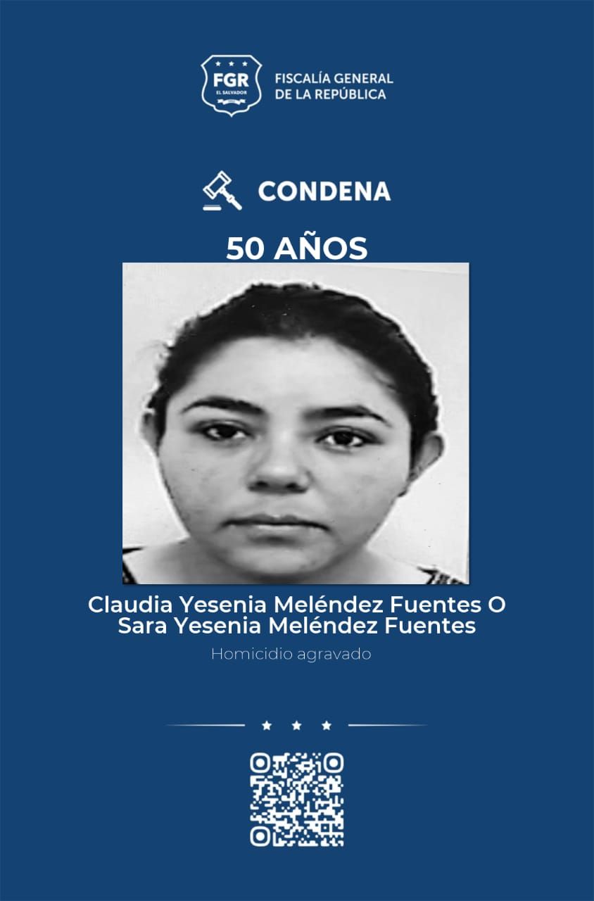Santa Tecla, La Libertad Sur. A 50 años de prisión fue condenada Claudia Yesenia Meléndez Fuentes o Sara Yesenia Meléndez Fuentes, por el homicidio agravado de su esposo. El crimen fue cometido en mayo del año 2011, en su vivienda ubicada en Santa Tecla, La Libertad Sur.