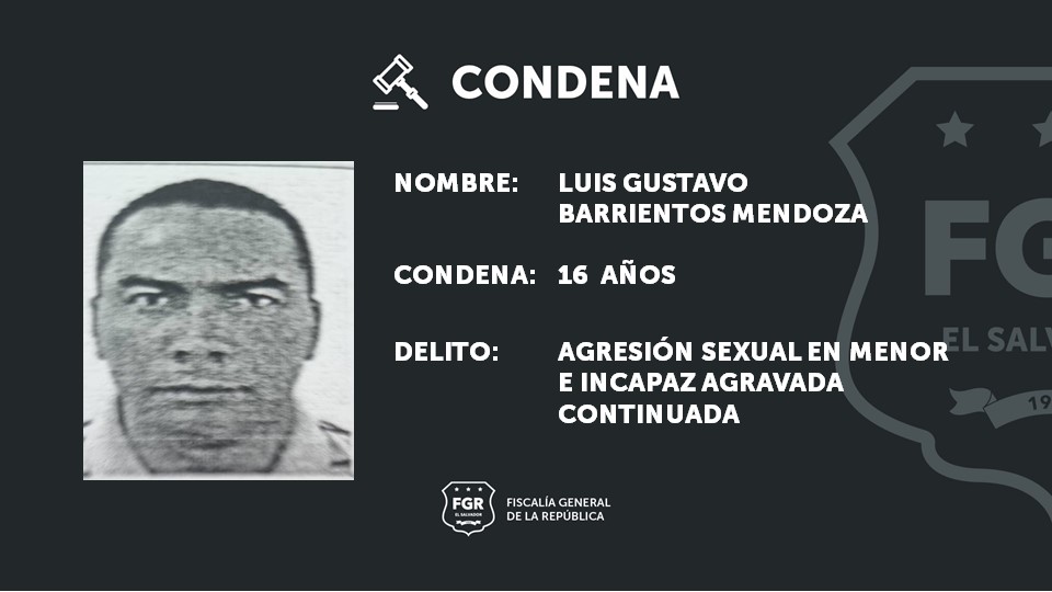 Santa Ana. Luis Gustavo Barrientos Mendoza fue condenado a 16 años de cárcel por haber agredido sexualmente a una menor de edad. La víctima, con mayoría de edad, decidió denunciar los abusos que en su niñez le causó el imputado.