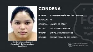 San Miguel. Por recibir dinero a través de depósitos electrónicos exigidos con amenazas a muerte, a nombre de la MS, en perjuicio de dos víctimas, Alejandra María Martínez Acosta fue sentenciada a 10 años de cárcel por el delito de Extorsión Agravada.