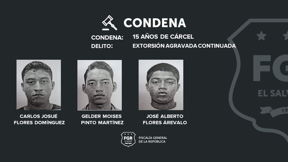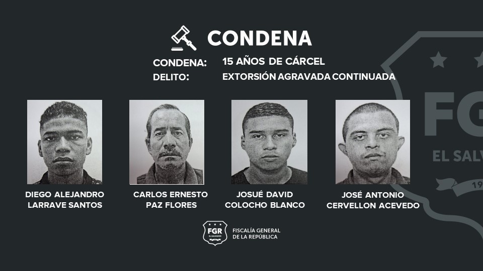 Santa Ana. La Fiscalía logró penas ejemplares que van desde los 20 hasta los 15 años de prisión para ocho pandilleros por el delito de extorsión agravada. De acuerdo a las investigaciones, estos sujetos exigieron $800 dólares de renta a la víctima y le habían amenazado de muerte si no les entregaba el dinero.