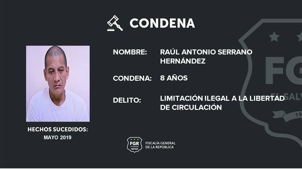 Santa Tecla, La Libertad. El cabecilla de la MS, Raúl Antonio Serrano Hernández, fue condenado a ocho años de prisión luego que la Fiscalía evidenciara que en el 2019, había limitado la libre circulación de una persona que habitaba en Tepecoyo, La Libertad.