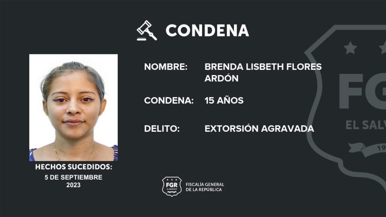 Santa Tecla, La Libertad Sur. Brenda Lisbeth Flores Ardón fue condenada a 15 años de cárcel por haber extorsionado a un trabajador de Colón, La Libertad Oeste.