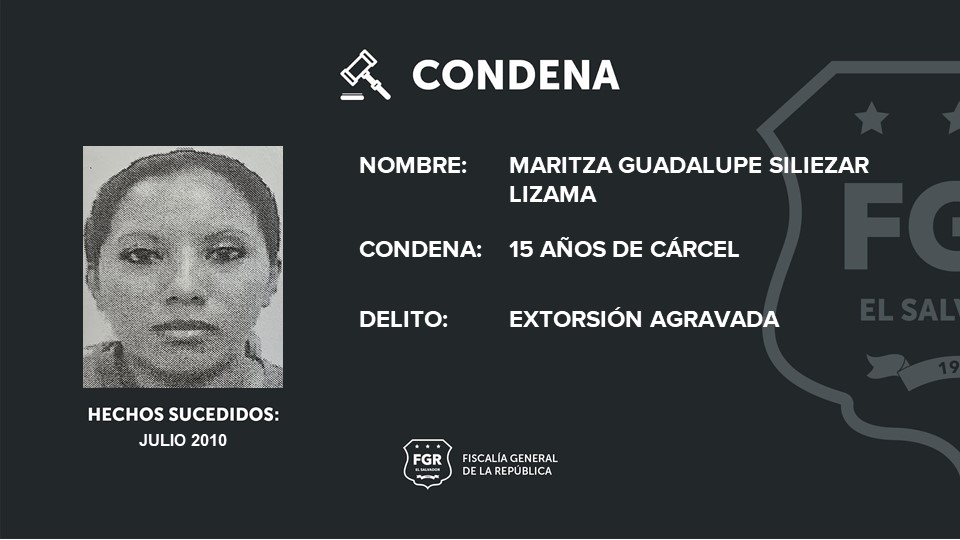 San Salvador. La Fiscalía General de la República (FGR) logró 15 años de cárcel para Maritza Guadalupe Siliezar Lizama, por extorsionar a un comerciante de Soyapango, San Salvador Este, durante el 2010.