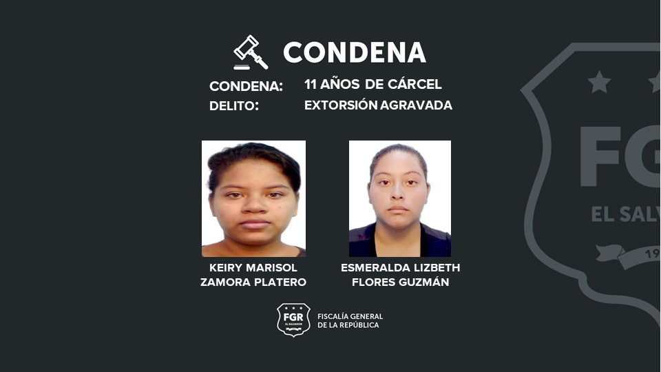 Santa Tecla, La Libertad Sur. Esmeralda Lizbeth Flores Guzmán y Keiry Marisol Zamora Platero, ambas pandilleras del Barrio 18, fueron condenadas a 11 años de cárcel por extorsionar a un comerciante de Colón, La Libertad Oeste.