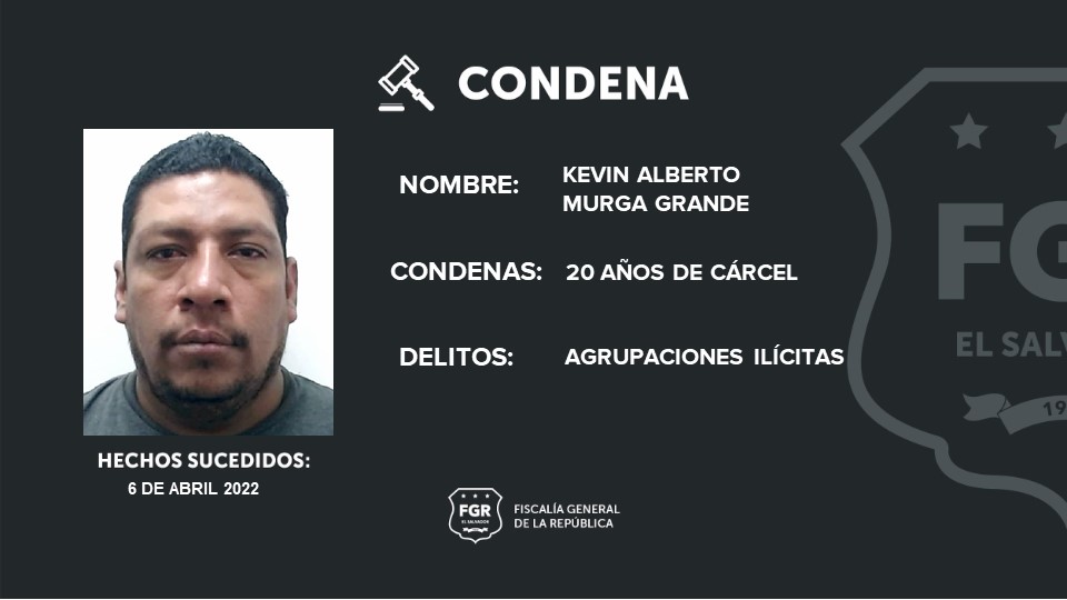 San Salvador. La Fiscalía General de la República logró que otro terrorista que se dedicaba a cometer diferentes actos criminales sea condenado a 20 años de prisión por el delito de agrupaciones ilícitas. Se trata de Kevin Alberto Murga Grande, alias topo.