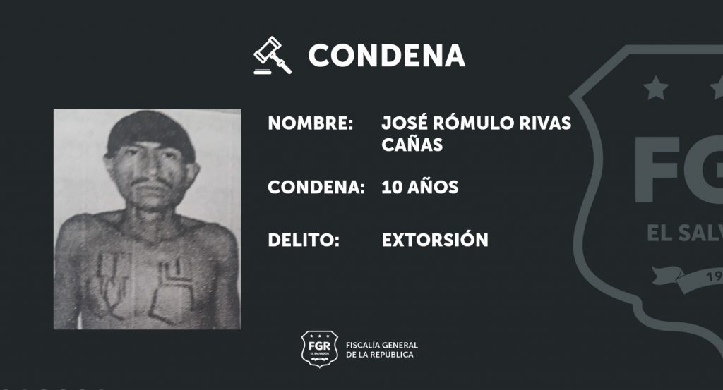 Ilobasco, Cabañas. José Rómulo Rivas Cañas, un reconocido miembro de la Mara Salvatrucha, fue condenado a 10 años de prisión por el delito de Extorsión; lo anterior, gracias a las pruebas presentadas por los fiscales.