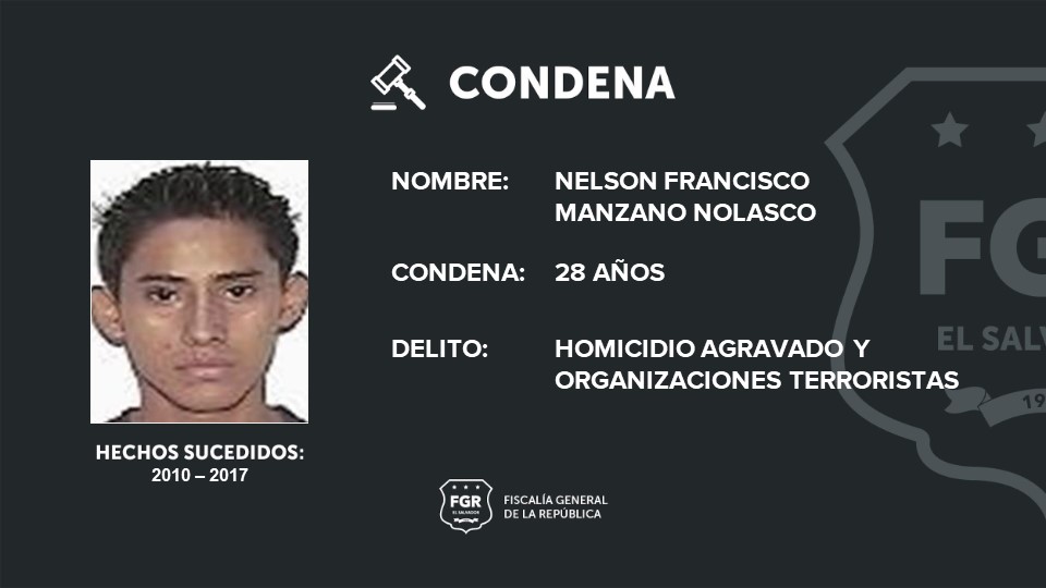 Gracias a las pruebas presentadas en juicio por la institución fiscal, el Tribunal Segundo contra el Crimen Organizado B de San Miguel, condenó a 28 años de prisión a  Nelson Francisco Manzano Nolasco, alias Nejo, por el homicidio agravado de Marvin Francisco Sánchez y organizaciones terroristas.