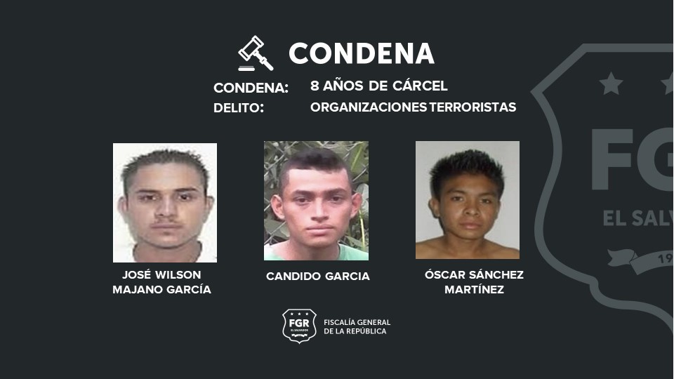 Los terroristas Óscar Alexander Sánchez Martínez, alias Pepe, Cándido Donatilo García García, alias Guacal,  Daniel Alberto Flores Cruz, alias Payaso, Marlon Edgardo Peraza Reyes, alias yegua, José Wilson Majano García, alias Wilson, José Francisco Argueta Zamora, alias Joche, Nilson Aníbal Martínez Gómez alias Spanky, recibieron una condena de 8 años de prisión por organizaciones terroristas.
