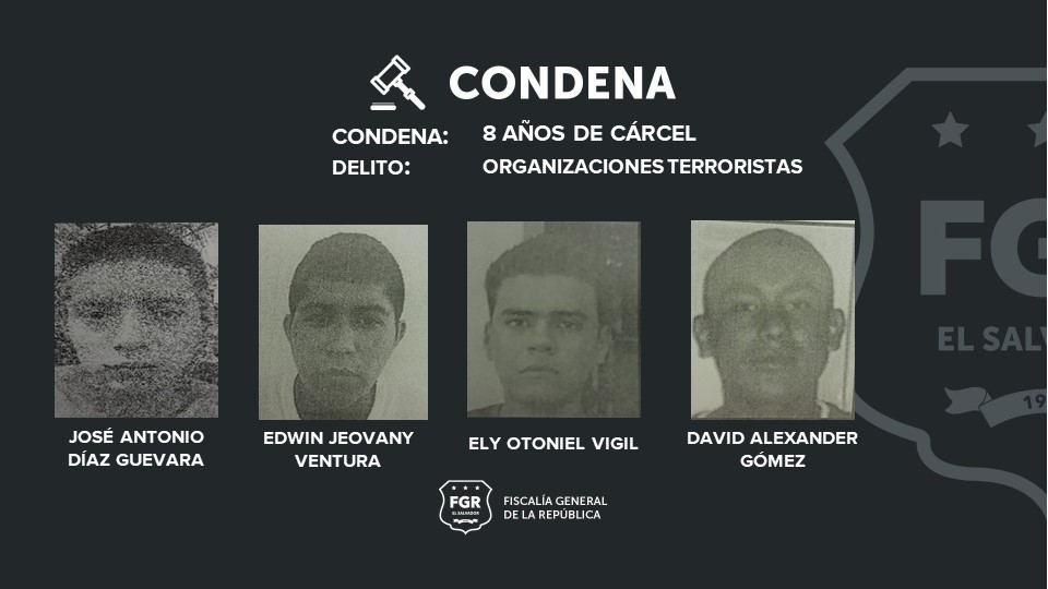 José Antonio Diaz Guevara, alias patinador (presente), Edwin Jeovany Ventura, alias mozote (presente), José Alfredo Argueta, alias fredy (rebelde), Ely Otoniel Vigil, alias ely (rebelde) y David Alexander Gómez, alias zorro (rebelde), fueron condenados a 8 años de prisión por organizaciones terroristas.