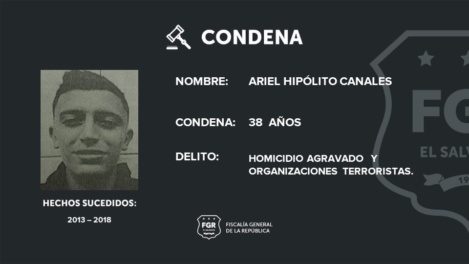 Ariel Hipólito Canales, alias Hipólito, (rebelde), fue condenado a 38 años de cárcel. Este pandillero y Chávez Luna asesinaron a balazos a un hombre en marzo de 2018; el crimen ocurrió en el barrio La Cruz de la ciudad de San Francisco Gotera, del departamento de Morazán.