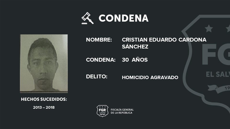 También, Cristian Eduardo Cardona Sánchez, alias mutante (presente), fue condenado a 30 años de cárcel -por un homicidio agravado-. El crimen se cometió la primera semana de abril de 2018, cuando Chávez Luna y Cardona asesinaron a un hombre en la colonia Morazán, siempre de la ciudad de San Francisco Gotera.
